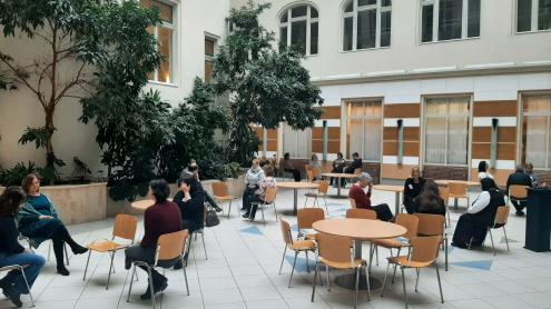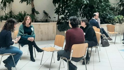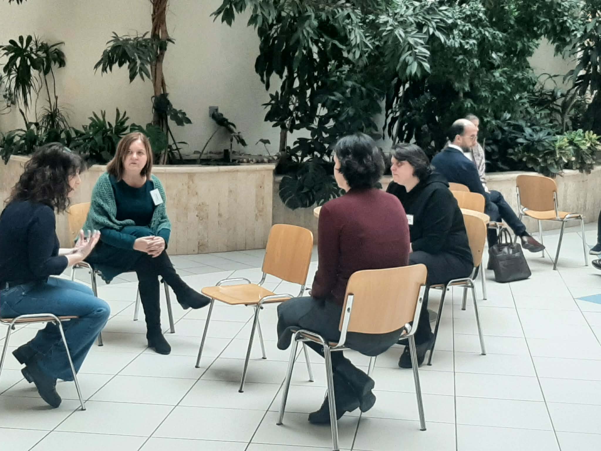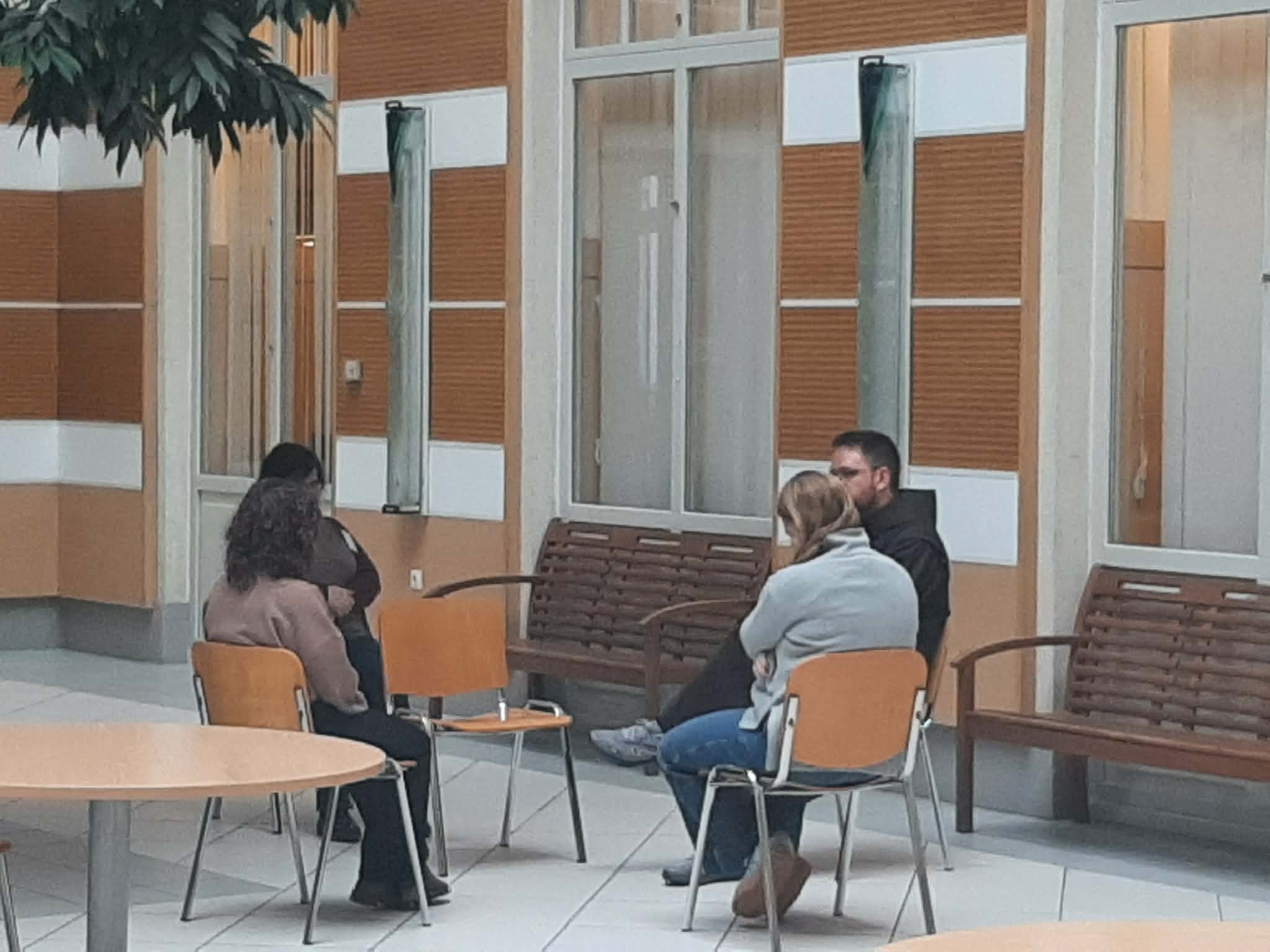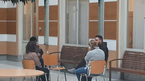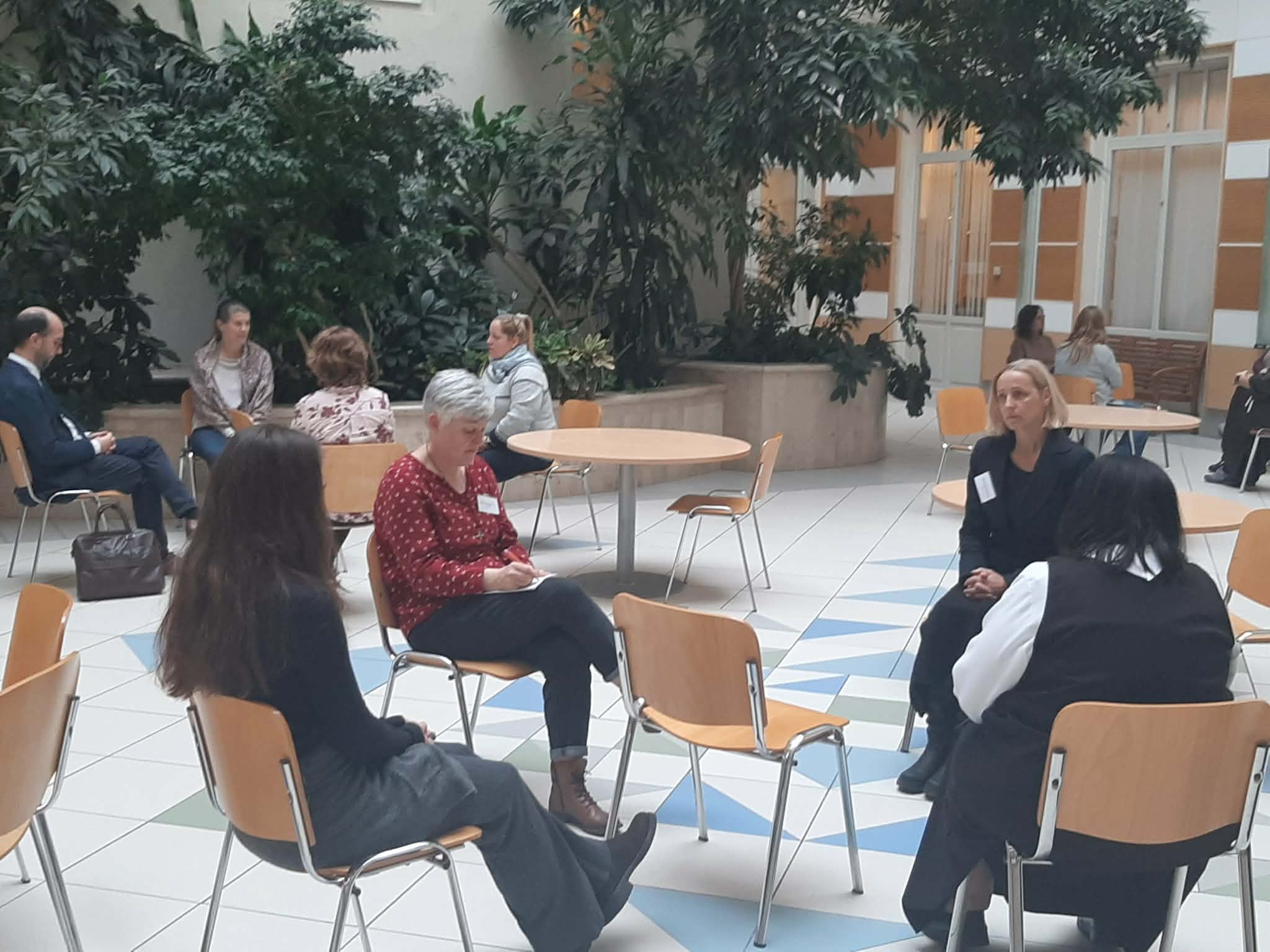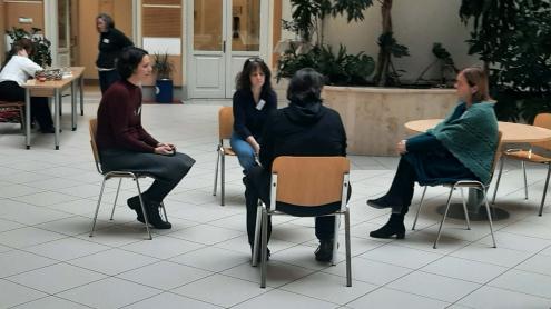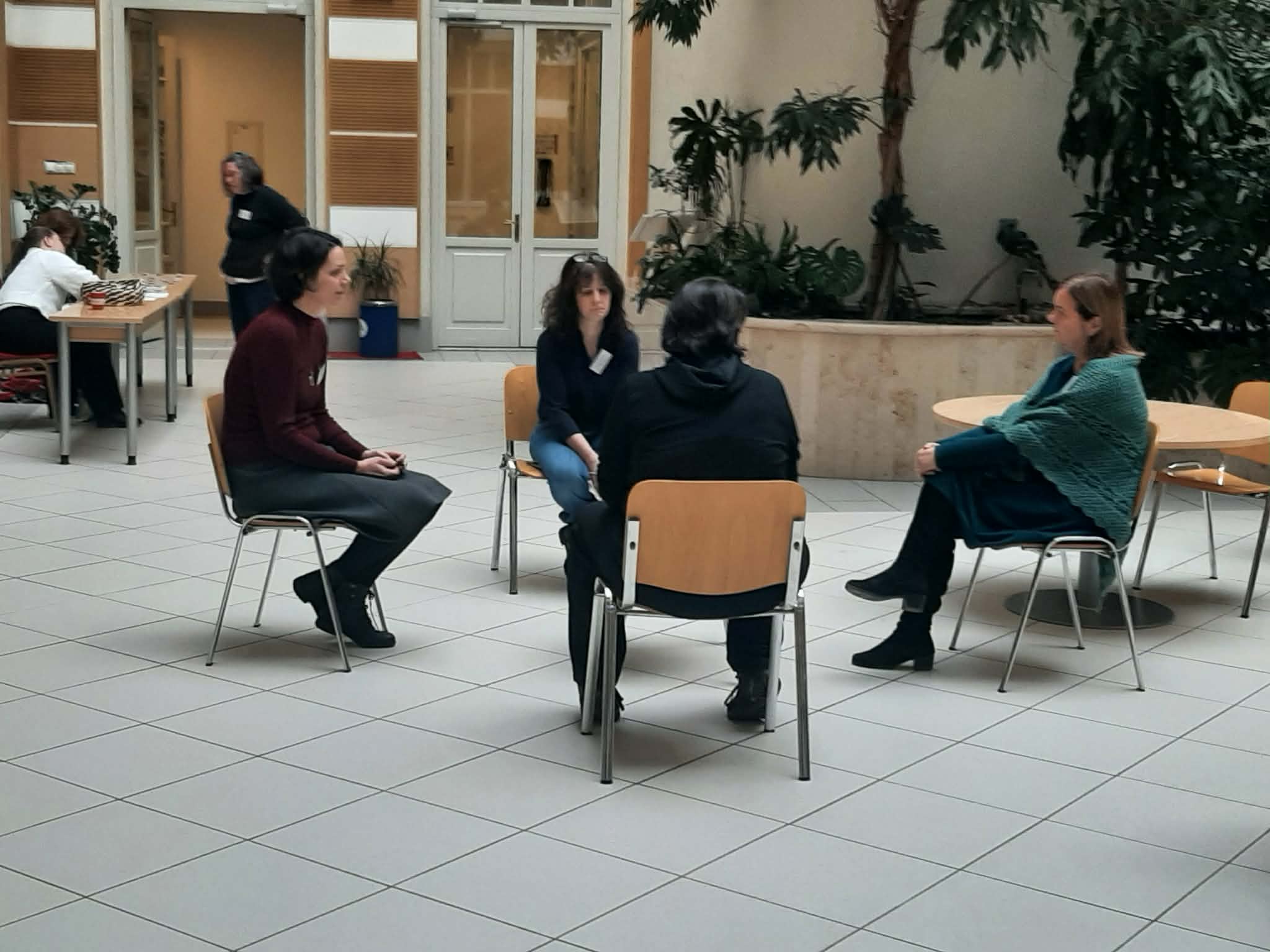 A nap kezdetén Kiss Gabriella pszichológus az elkövetői lét pszichológiája és pszichodinamikája címmel vezetett csoportmunkát. Először pszichodráma gyakorlatra kérte a résztvevőket kis csoportokban. Mindenkinek belehelyezkedett egy bántalmazásos ügy szereplőinek helyzetébe, (hozzátartozó, pszichológus, kihallgató és az Isten) majd kis csend után csak egy kérdést tehettek fel a középen lévő üres széknek, amely az elkövetőt szimbolizálta. Aztán szerepcsere következett. A gyakorlat után megosztották egymással nagy körben, hogy melyik szerepből (székből) mit éltek meg. Mindannyian egyetértettek abban, hogy ez nehéz gyakorlat volt, mély érzelmeket szabadított fel.