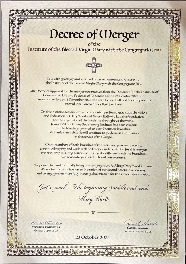 A Ward Mária Intézet két ága november 4-én ünnepélyes keretek között hivatalosan és jogilag is eggyé vált. A Loreto nővérek (IBVM) és az angolkisasszonyok (CJ) együtt alakítják jövőjüket Congregatio Jesu néven.