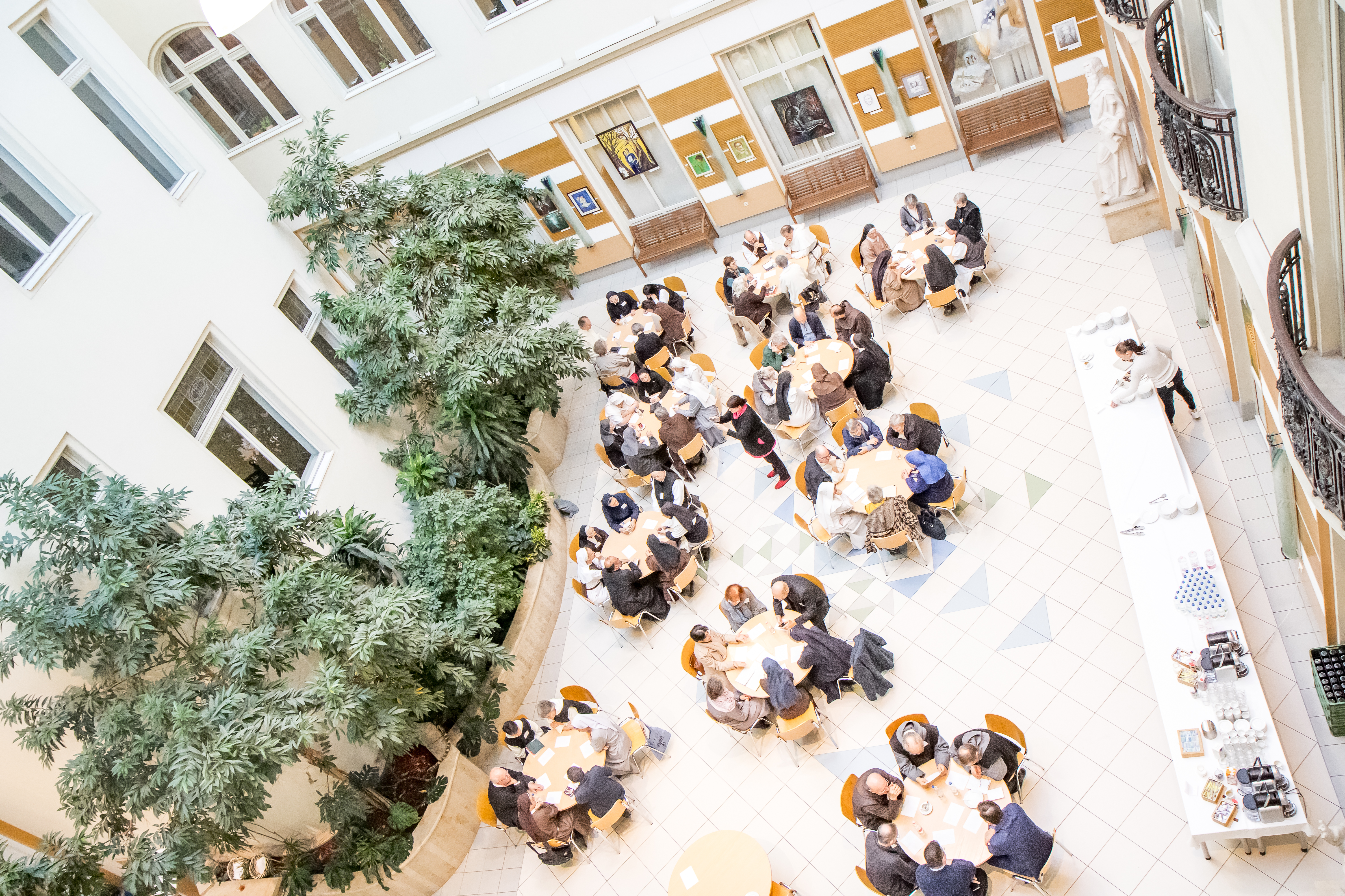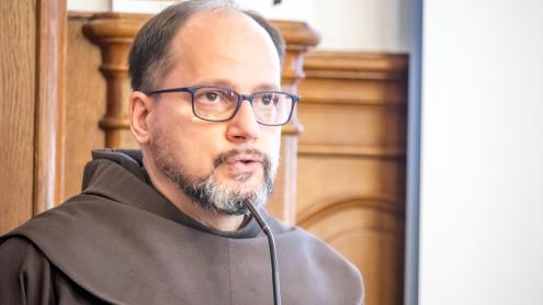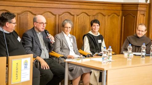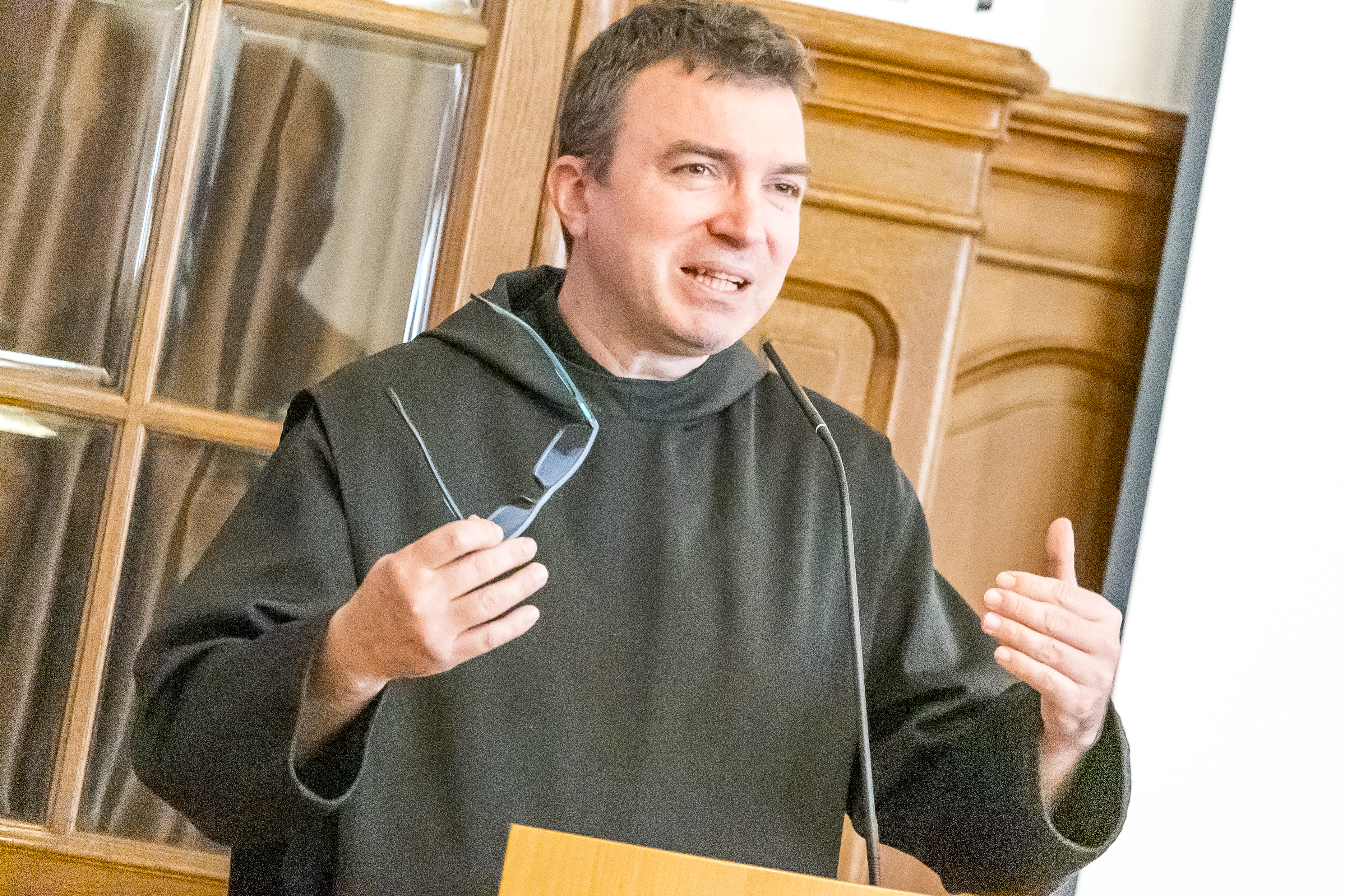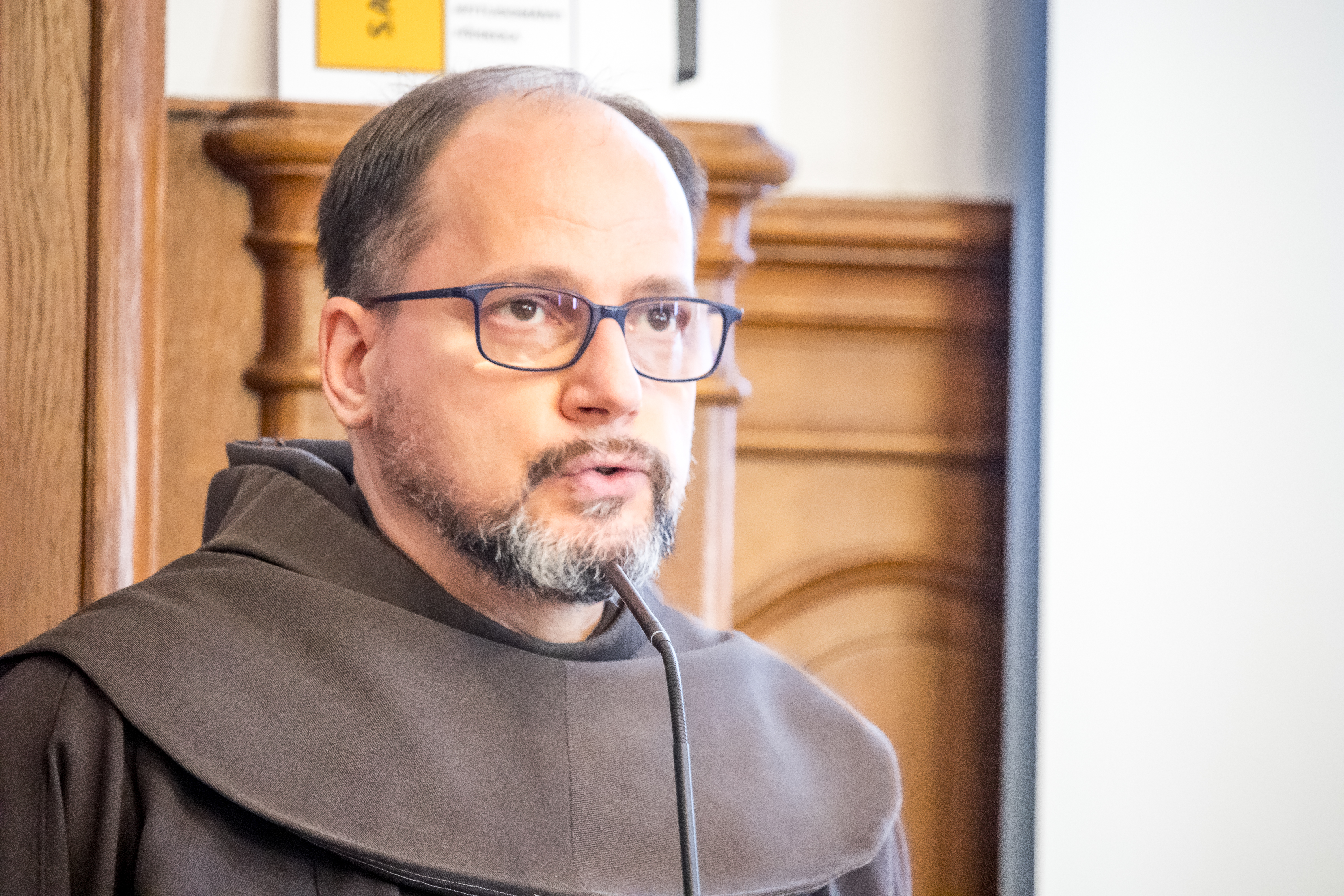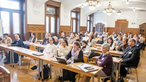 A plenáris a díszteremben folytatódott, ahol Dr. Bagyinszki Ágoston OFM, a Sapientia Szerzetesi Hittudományi Főiskola rektora köszöntötte a jelenlévőket, majd ismertette a szerzetesi főiskola fejlesztési tervét.
