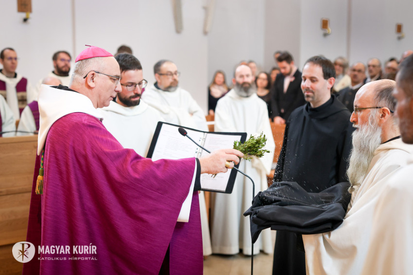 Megáldotta a kórusruhát, amit felsegítettek az örökfogadalmas szerzetesre, aki aztán békecsókot váltott bencés közösségének tagjaival.