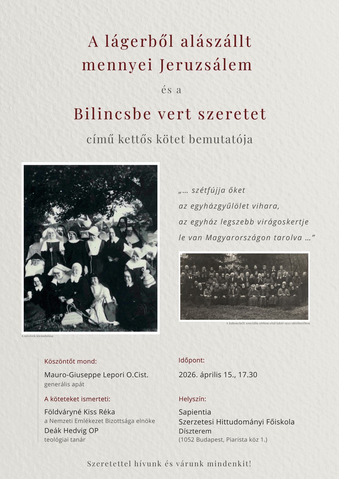 A szerzetesrendek feloszlatására emlékező kettős kötetet mutatnak be a Sapientián 2026. április 15-én. Köszöntőt mond Mauro-Giuseppe Lepori O.Cist generális apát. A köteteket ismerteti: Földváryné Kiss Réka, a Nemzeti Emlékezet Bizottsága elnöke és Deák Viktória Hedvig OP teológus.