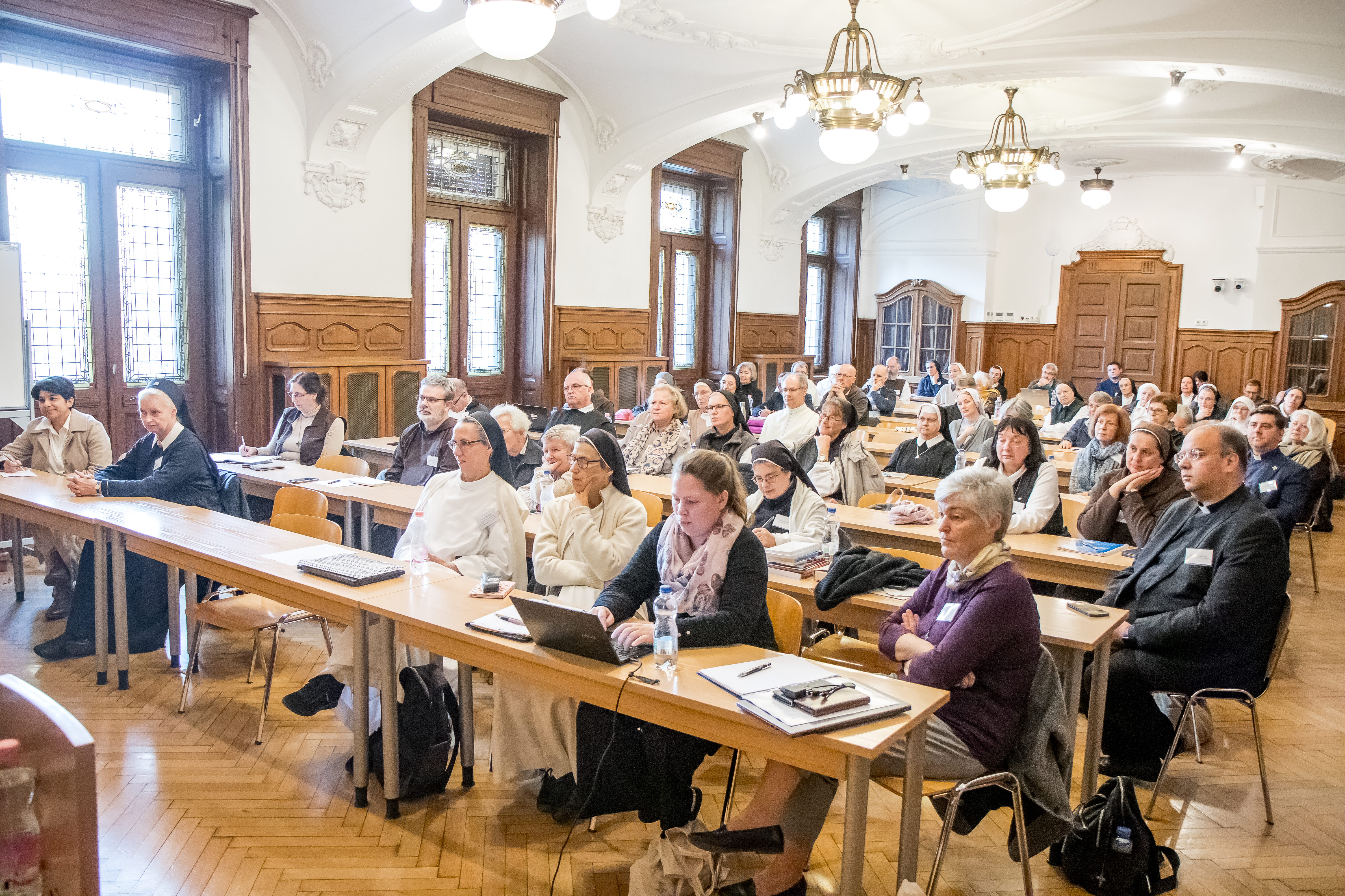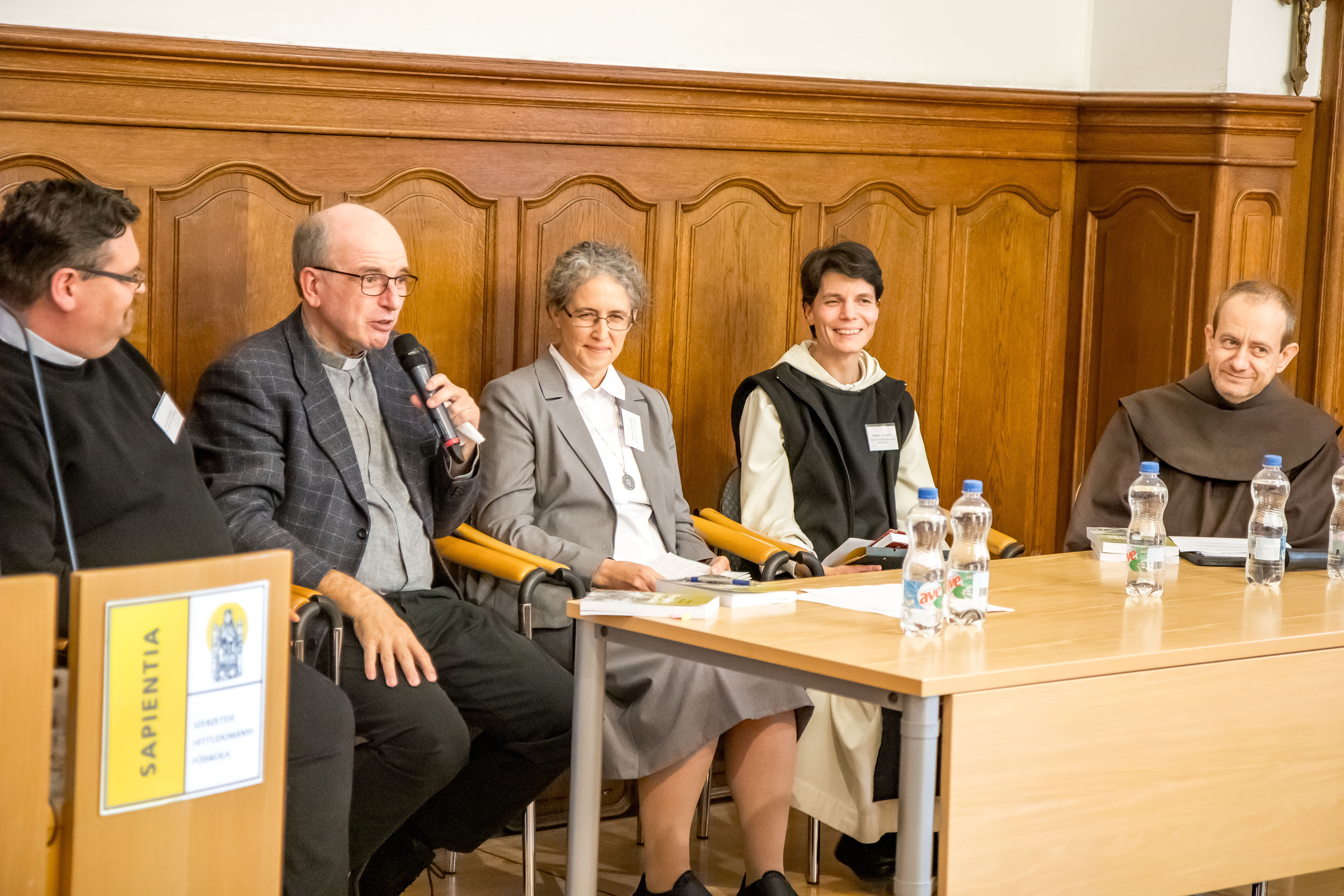 A plenáris a díszteremben folytatódott, ahol Dr. Bagyinszki Ágoston OFM, a Sapientia Szerzetesi Hittudományi Főiskola rektora köszöntötte a jelenlévőket, majd ismertette a szerzetesi főiskola fejlesztési tervét.