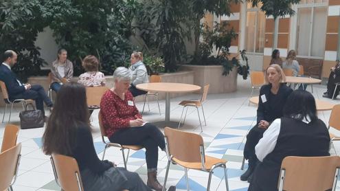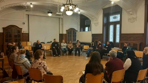 A nap kezdetén Kiss Gabriella pszichológus az elkövetői lét pszichológiája és pszichodinamikája címmel vezetett csoportmunkát. Először pszichodráma gyakorlatra kérte a résztvevőket kis csoportokban. Mindenkinek belehelyezkedett egy bántalmazásos ügy szereplőinek helyzetébe, (hozzátartozó, pszichológus, kihallgató és az Isten) majd kis csend után csak egy kérdést tehettek fel a középen lévő üres széknek, amely az elkövetőt szimbolizálta. Aztán szerepcsere következett. A gyakorlat után megosztották egymással nagy körben, hogy melyik szerepből (székből) mit éltek meg. Mindannyian egyetértettek abban, hogy ez nehéz gyakorlat volt, mély érzelmeket szabadított fel.