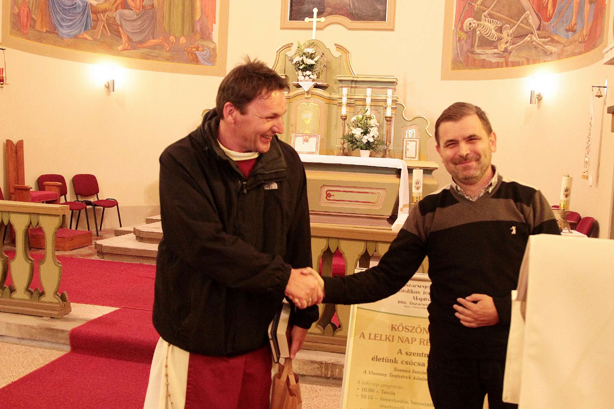A közös napközi imaóra elvégzését követően P. Szenes István, a Vianney Testvérek Közösségének priorja két elmélkedésben segítette a résztvevőket, hogy mélyebben megértsék a szentmisét, ami életünk csúcsa és forrása, ahogyan a II. Vatikáni Zsinat fogalmaz. Az első elmélkedés lehetőséget adott arra is, hogy megismerjék a lelkinap résztvevői a Debrecen-Nyíregyházi Egyházmegye területén megszületett szerzetesi közösség karizmáját. Ahogyan István atya fogalmazott, teljesen nem lehet megragadni Jézus életét, de Jézus ruhájának egy-egy szegélyét megérintve, utánozhatjuk őt. Ezért is született annyi szerzetei közösség, mind-mind egy-egy részletére rácsodálkozva Jézus kimeríthetetlen titkára. A Vianney Testvérek Közössége a tisztuló lelkekért adott életfelajánlás útját járják, megvalósítva azt a hitigazságot, amit a szentek közössége fejez ki. A szentmise bevon minket ebbe a szent közösségbe, hiszen kapcsolatban vagyunk mindazokkal, akik előttünk jártak. Ezért is lehetséges az, hogy a szentmisét imádkozva elmondhatjuk mindazt, amit itt a földön már nem volt alkalmunk elmondani azoknak, akiket szerettünk.