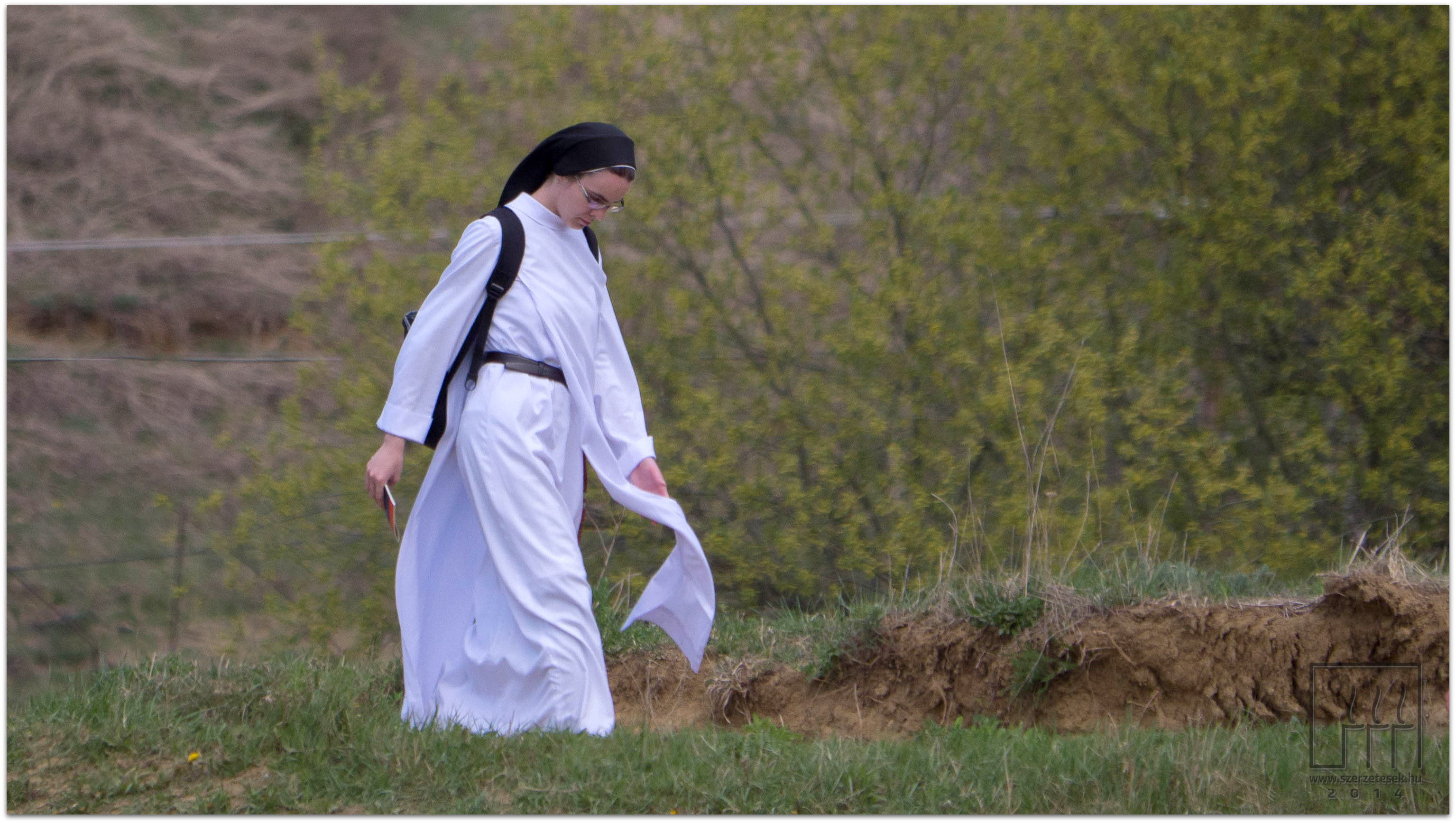 Másnap, 24-én Laudessel indult a nap, azt követően szentmisén imádkoztunk tovább, majd a lelki táplálék után testi táplálékot is kaptunk, így testileg-lelkileg feltöltődve indulhattunk neki a zarándokutunknak. A településeken énekeltünk, integettünk a járókelőknek, és a menetünk élén haladó keresztet olykor odavittük az út szélén várakozó embereknek, hogy megcsókolhassák. A természetben pedig lehetőségünk nyílt spontán beszélgetésekre. Számomra különösen is fontos volt más közösségek jelöltjeivel, novíciáival beszélgetni. Hallani az örömeikről, nehézségeikről, osztozni arról, hogy miért fontos nekünk a közösség, ahová tartozunk. Meglátni az emberi gyengeségek közepette is felcsillanó isteni hívást, isteni szándékot az odaszenteltségre. Ajándék volt találkozni erdélyi származású szerzetesekkel, beszélni a hazaiakról, hiszen nem is olyan régen, ezelőtt négy évvel még én is Erdélyben éltem. Zarándoklatunk sajátos színfoltja volt a görögkatolikus, monasztikus életet élő nővérek lelkes, örömöt sugárzó jelenléte.