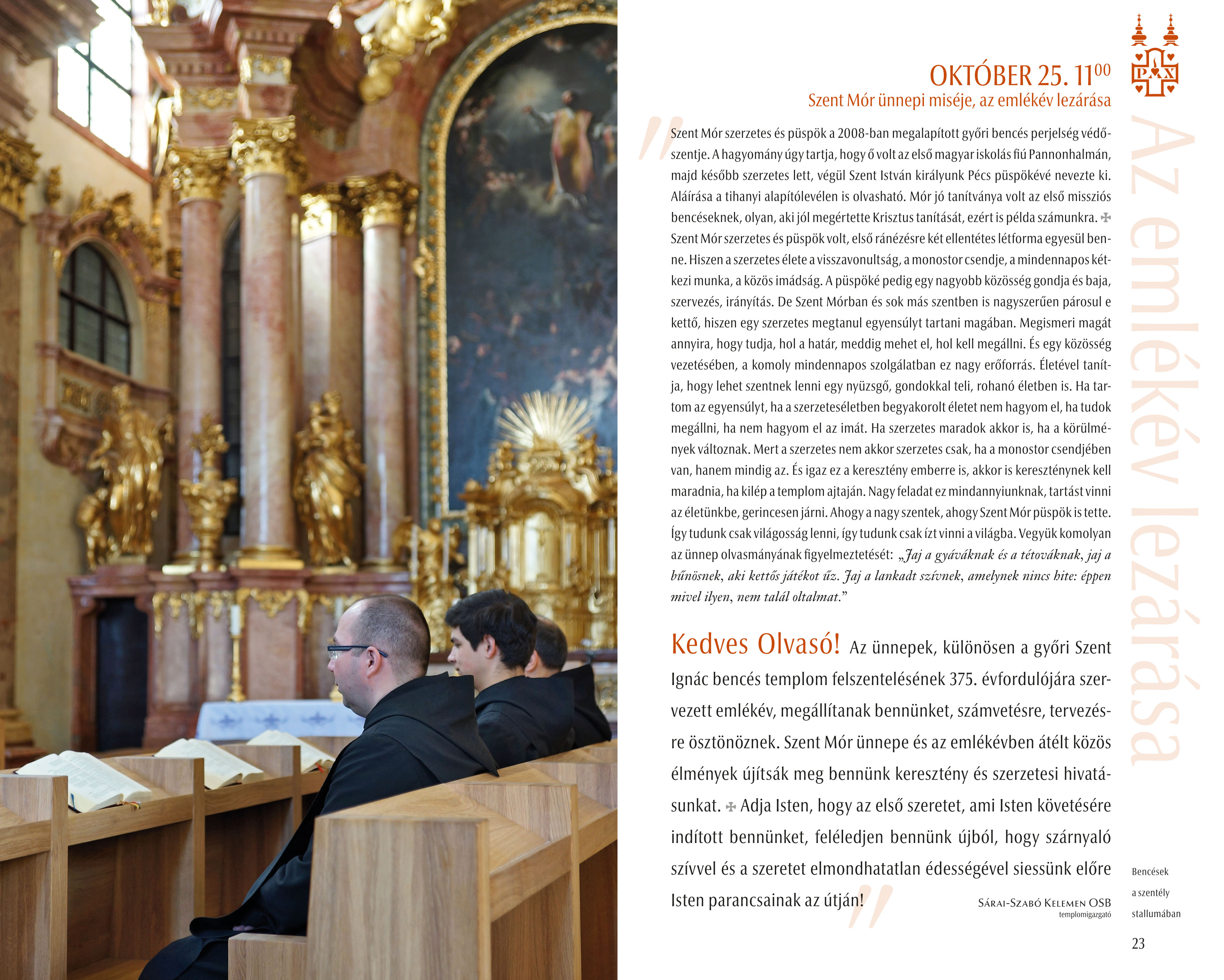 Az ünnepek, különösen a győri Szent Ignác bencés templom felszentelésének 375. évfordulójára szervezett emlékév, megállítanak bennünket, számvetésre, tervezésre ösztönöznek. Szent Mór ünnepe és az emlékévben átélt közös élmények újítsák meg bennünk keresztény és szerzetesi hivatásunkat. Adja Isten, hogy az első szeretet, ami Isten követésére indított bennünket, feléledjen bennünk újból, hogy szárnyaló szívvel és a szeretet elmondhatatlan édességével siessünk előre Isten parancsainak az útján!"
